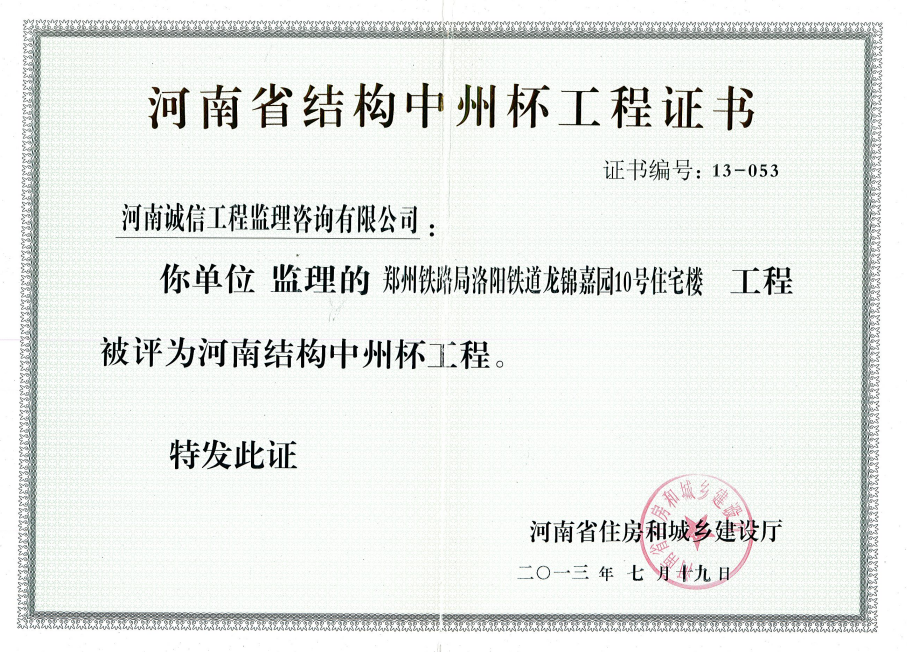 2013年鄭州鐵路局廬陽鐵道龍錦嘉園工程被評為河南省結(jié)構(gòu)中州杯