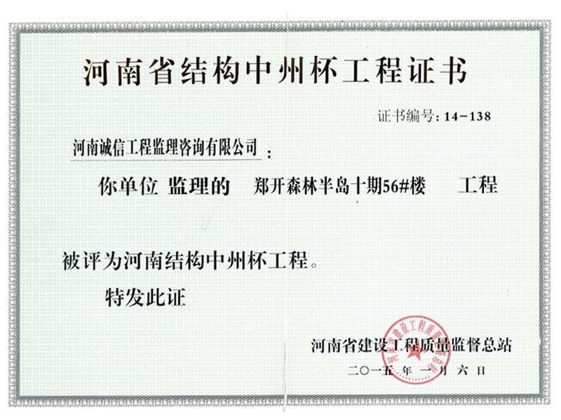 2015年鄭開森林半島工程被評為“河南省結(jié)構(gòu)中州杯工程”