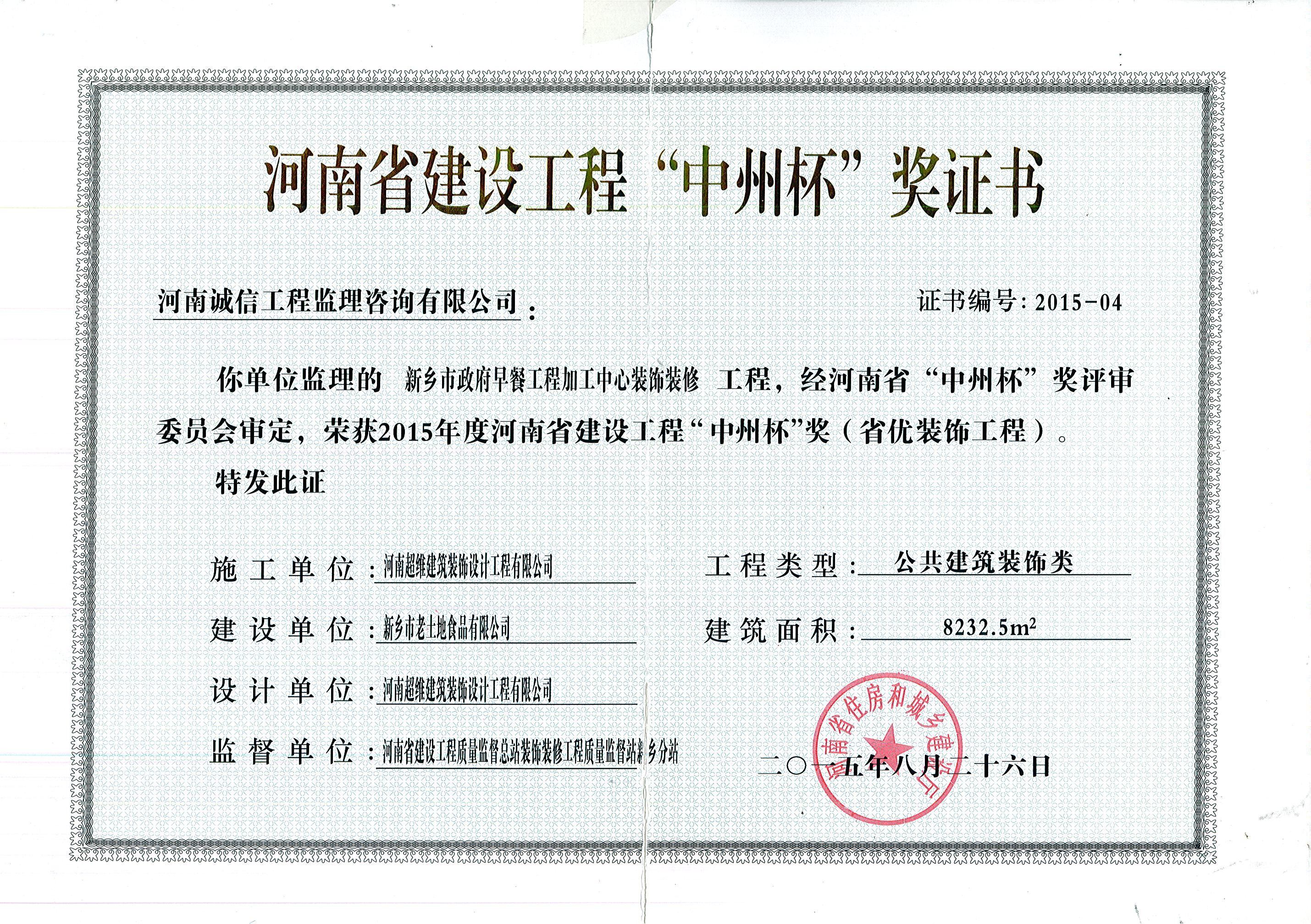 2015年新鄭市政府早餐工程加工中心裝飾裝修工程被評為河南省建設(shè)工程“中州杯獎”(省優(yōu)質(zhì)裝飾工程)