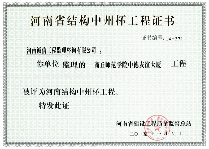 2015年商丘師范學(xué)院中德友誼大廈工程被評為“河南省結(jié)構(gòu)中州杯工程”