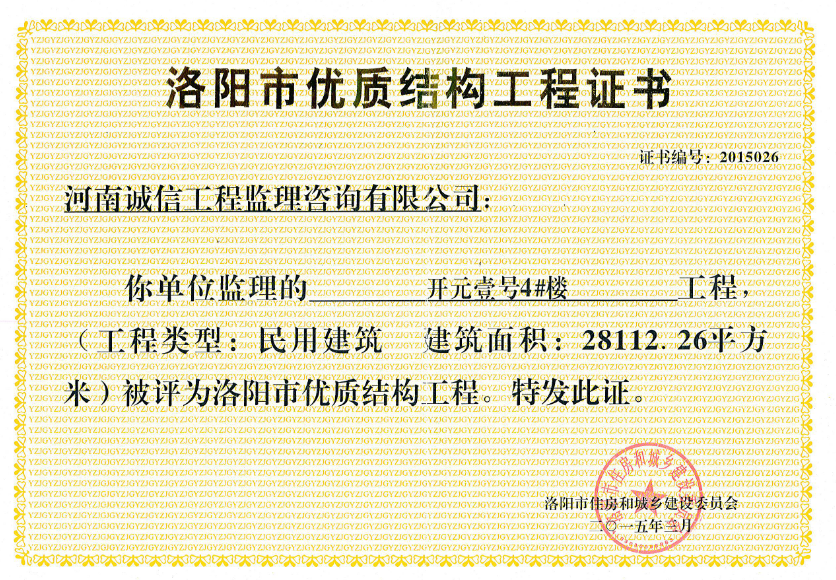 2015年開元壹號工程被評為“洛陽市優(yōu)質(zhì)結(jié)構(gòu)工程”