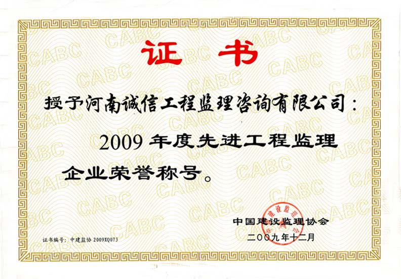 2009年度先進工程監(jiān)理企業(yè)榮譽稱號