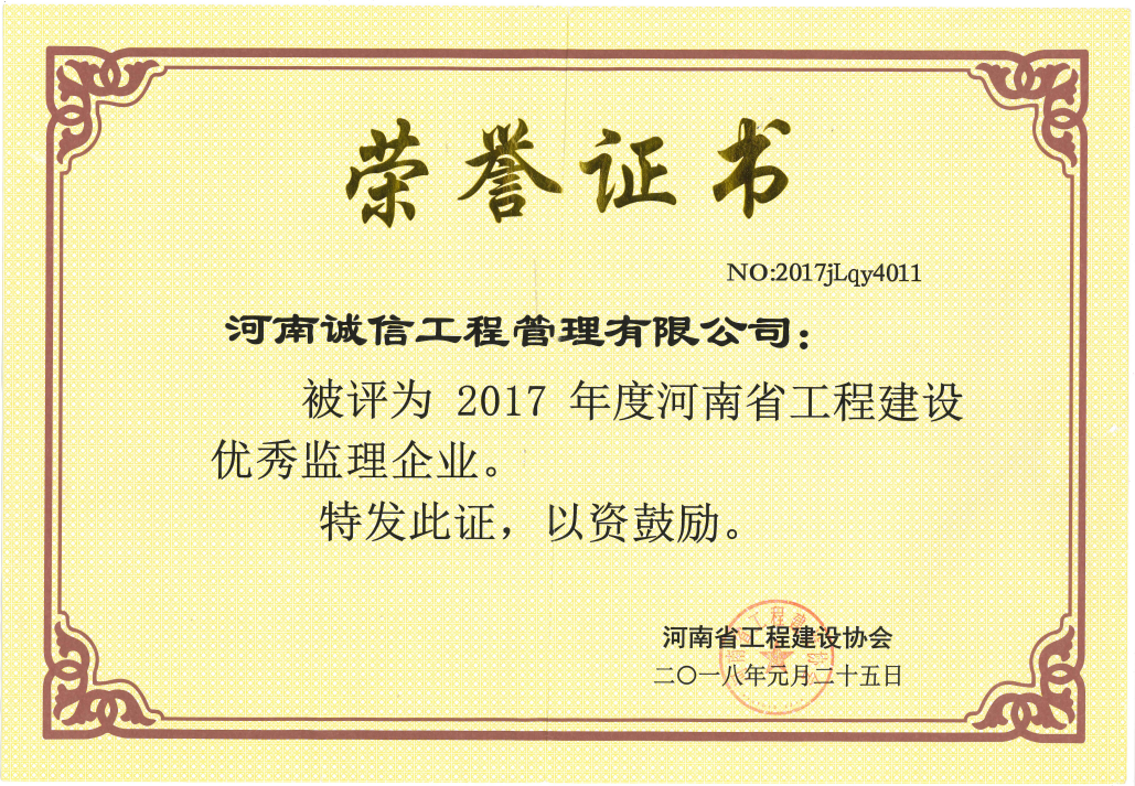 被評為2017年度河南省工程建設優(yōu)秀監(jiān)理企業(yè)