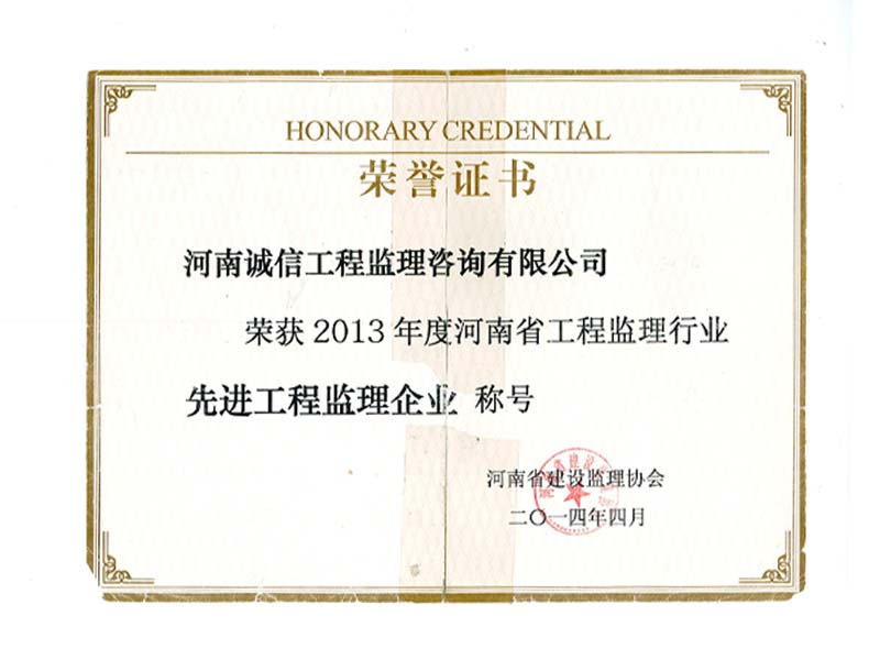榮獲2013年度河南省工程監(jiān)理行業(yè)“先進工程監(jiān)理企業(yè)”稱號